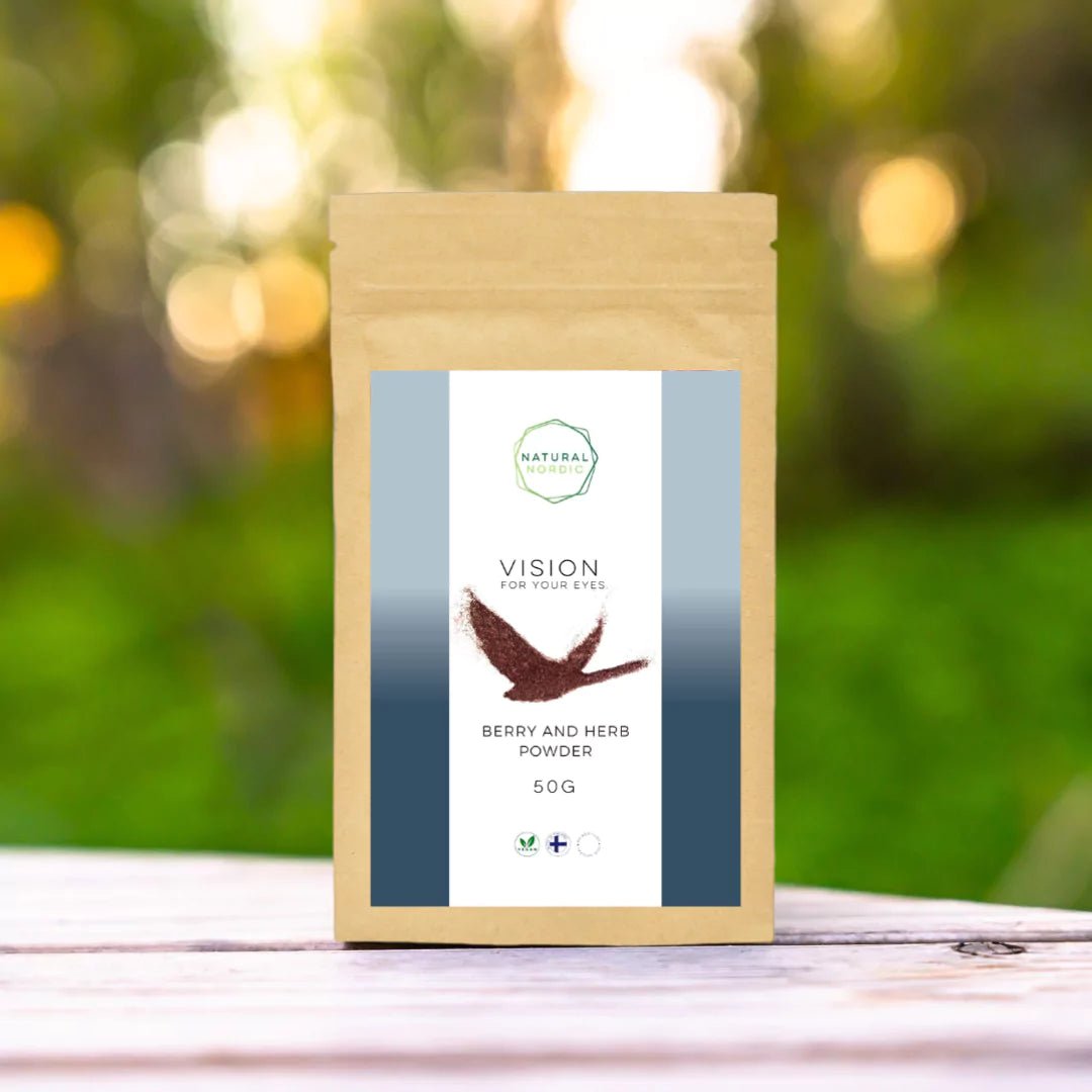 Dark blue kick to your immune system combines nutrition from bilberry, blackcurrant (both berries and leaves), and crowberry together with Garden Angelica and cornflower. Vision has flavonols and vitamins (A, C, E and K), dietary fiber, copper and manganese. Wild blueberries (aka bilberries) have a multiple amount of beneficial compounds as opposed to blueberries, whereas blackcurrant seeds contain vitamin E and many polyunsaturated fatty acids which are best in the crushed and powdered form.