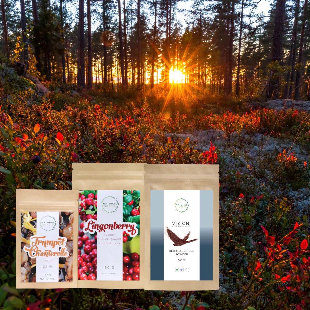 Enjoy the abundance of autumn through this thoughtfully curated package. It comprises of 25g trumpet chanterelle powder, 50g of lingonberry powder, and 50g Vision berry and herb powder package brimming with a harmonious blend of berries and herbs.